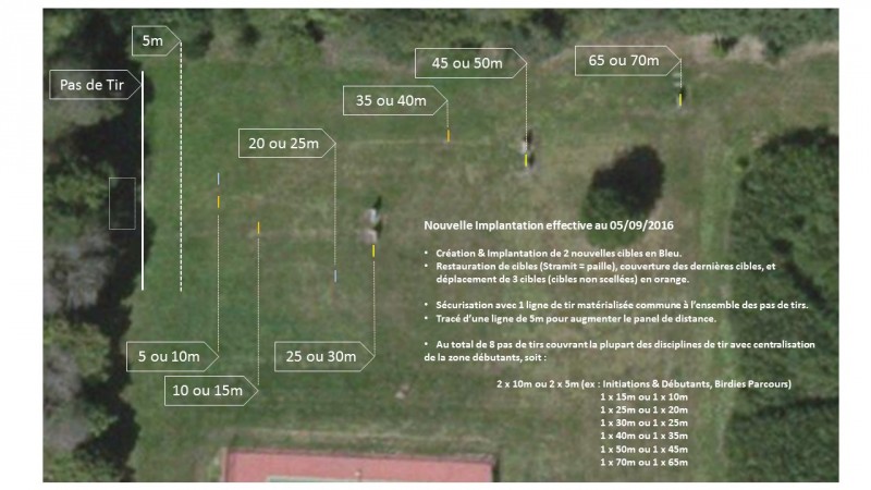 2 Cibles supplémentaires (8 au total), 1 Pas de Tir commun, à l'image du Tir en Salle avec variation possible. 1 Pas de plus vers la sécurité sous la vigilance des Entraîneurs et/ou Directeurs de Tirs. Cette implantation sera en test jusqu'à la fermeture du site pour l'hiver 2016-2017