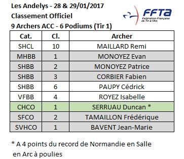 1 clin d’œil au passage au Jeune Duncan SERRUAU qui porte 1 score à 4 pts du record de Normandie, ce jeune cadet classé 6ème au classement National participera aux Championnat de France en Salle à Nîmes les 17, 18 et 19 février 2017 ![]()